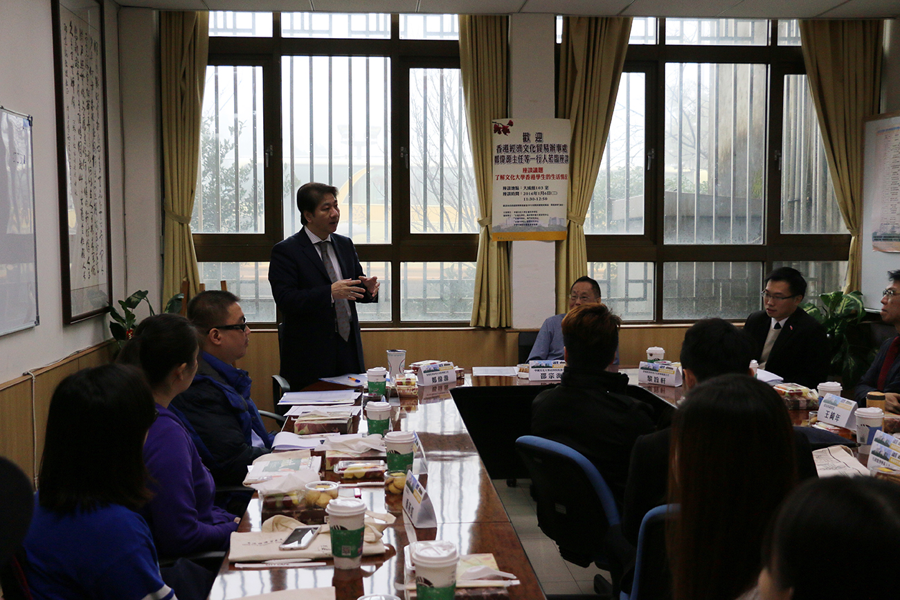 Director of the Hong Kong Economic, Trade and Cultural Office (HKETCO), Mr Rex Chang, visited Chinese Culture University on 6 January. He met with President of Chinese Culture University, Dr Lee Tien-ren, and exchanged with Hong Kong students studying at the university to learn more about their life and learning environment. Mr Chang also took the opportunity to remind the students to pay attention to road safety.